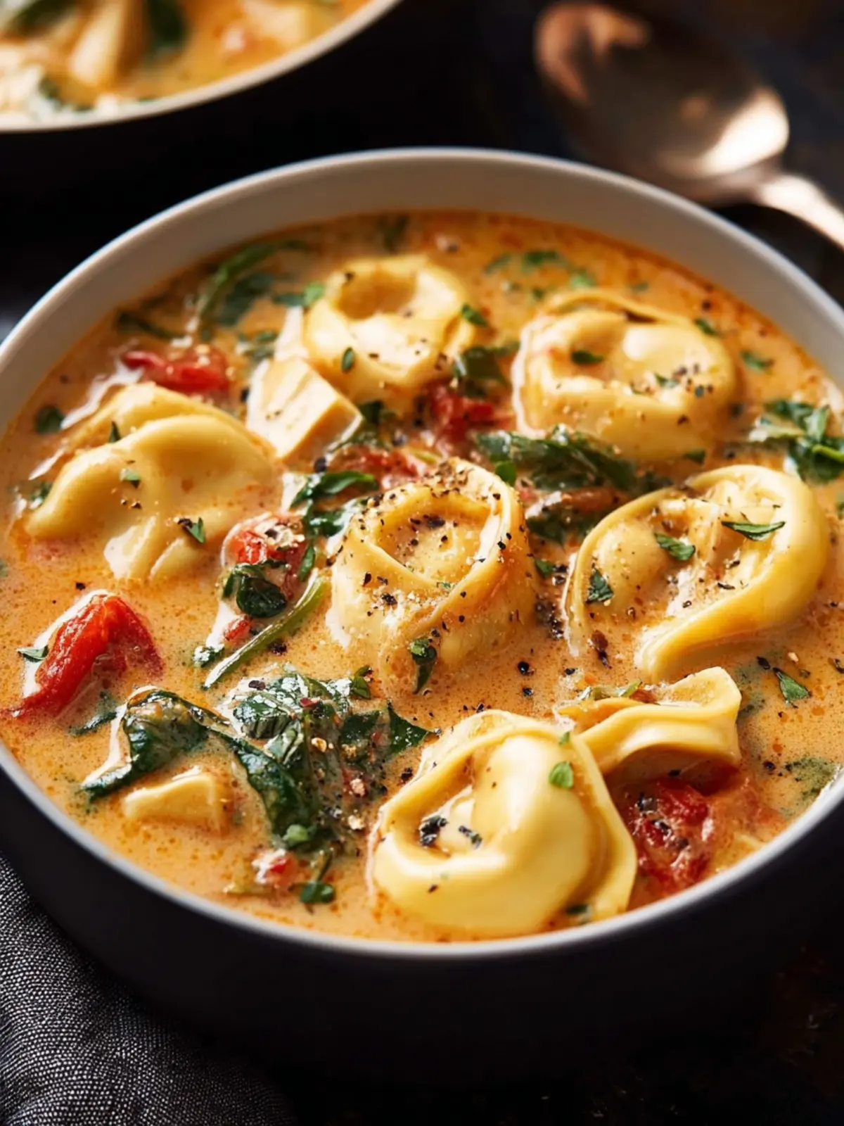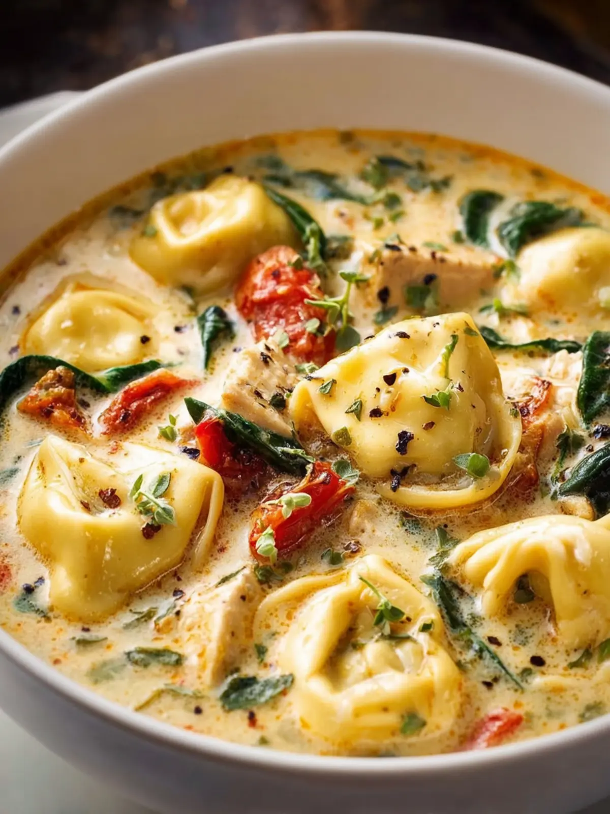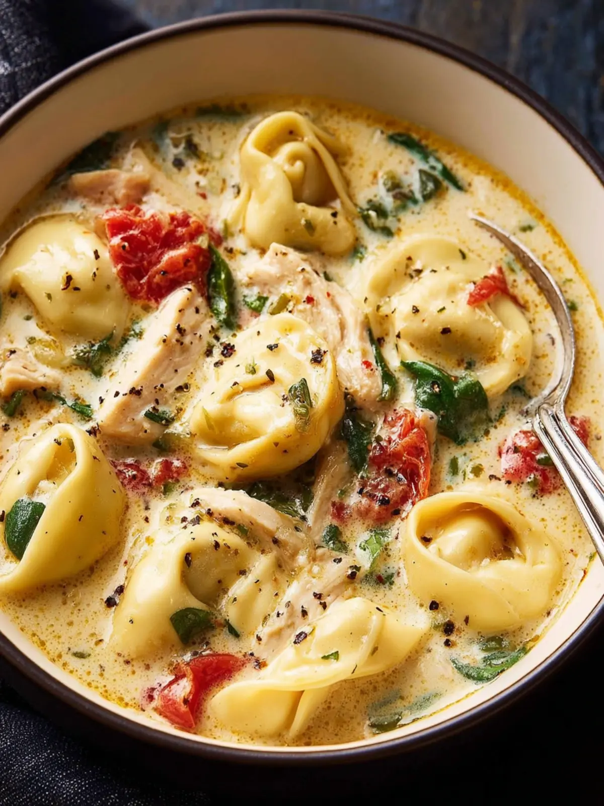 A rich and creamy soup featuring chicken, tortellini, and spinach, perfect for a comforting meal.