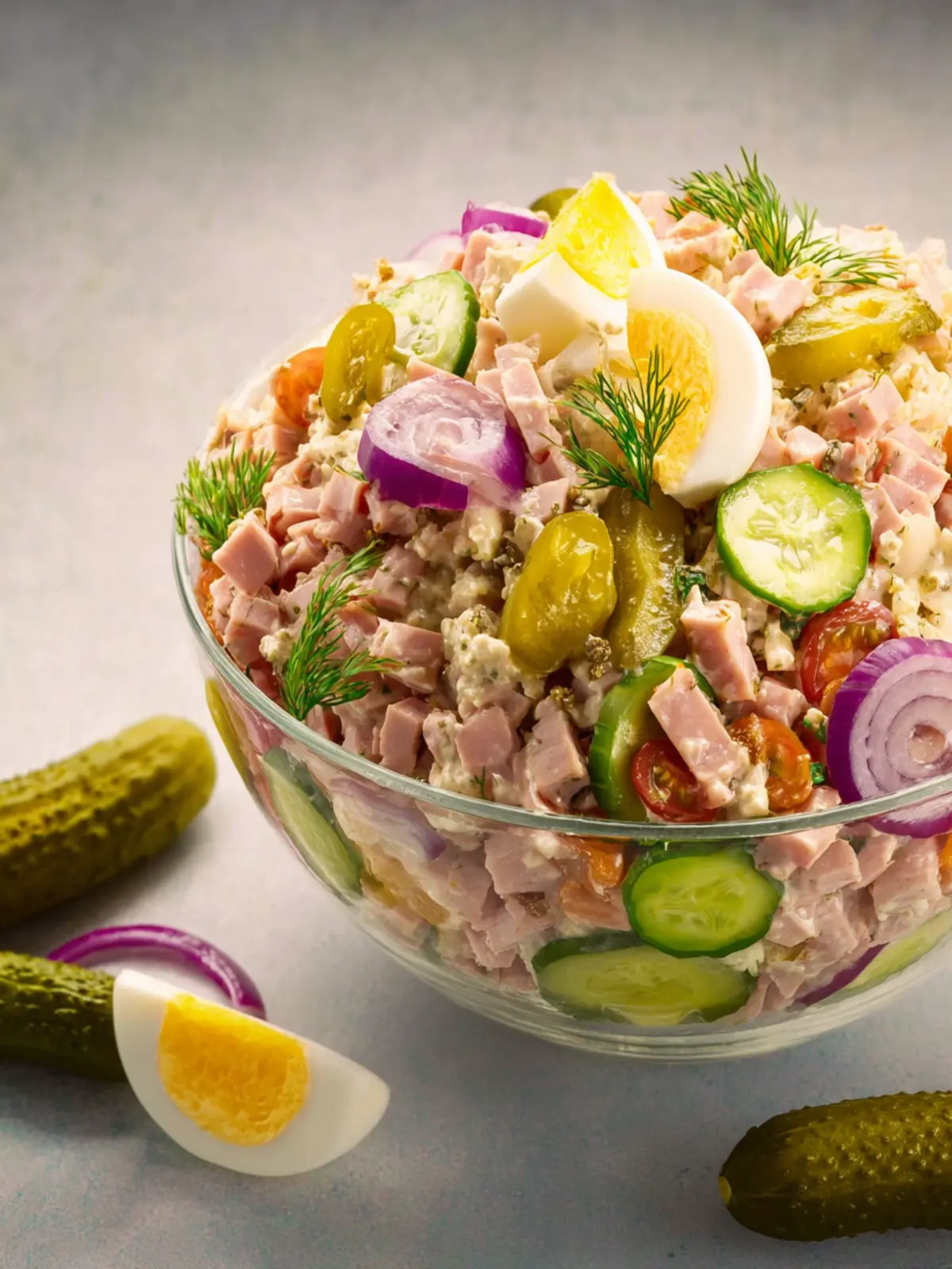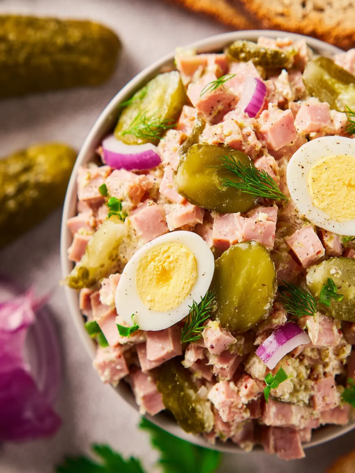 Ham: The star of the show is, of course, the ham. Opt for a good quality deli ham, preferably smoked or honey-glazed for added depth of flavor. It gives the salad a hearty base.