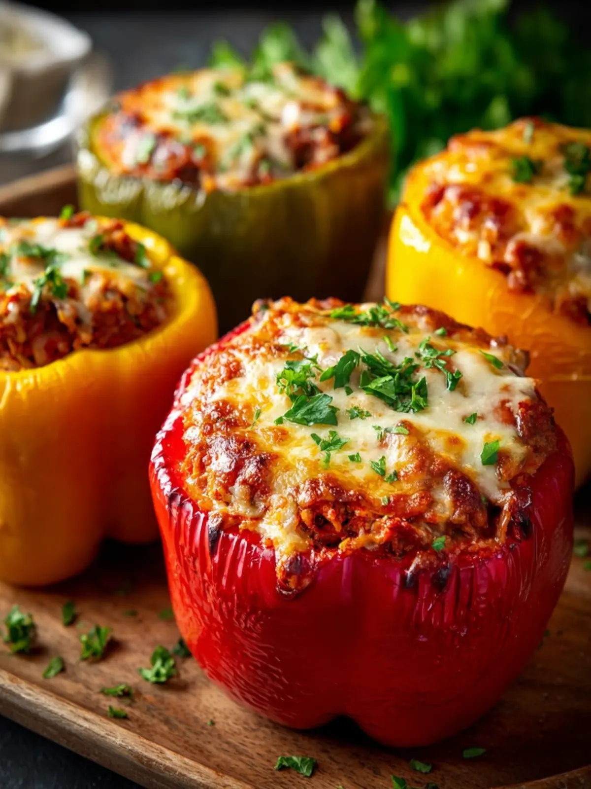 Delicious stuffed bell peppers filled with a savory mixture of ground beef, rice, and cheese.