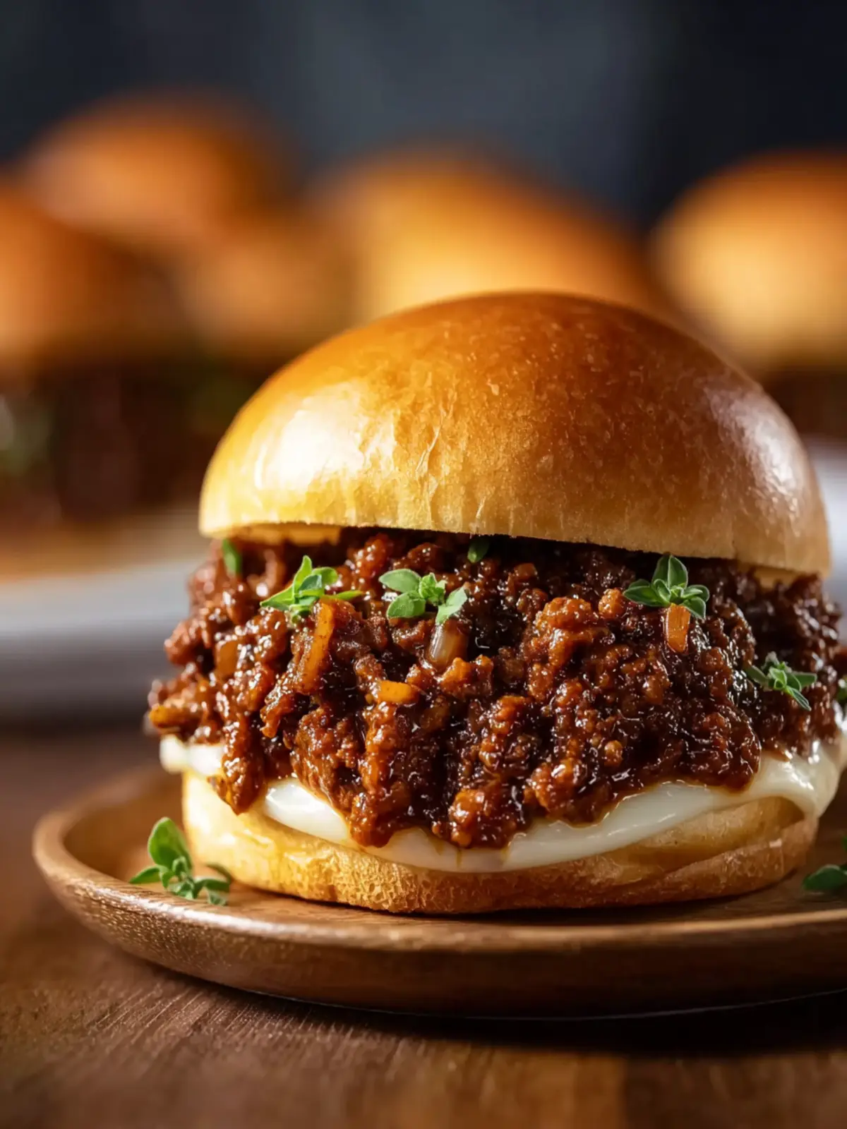 - Toast and Assemble: Optional but worth it: lightly butter the buns and toast them in a pan until golden. Spoon the beef mixture onto the bottom half of each bun and sprinkle generously with shredded Gruyère cheese. If you like it extra melty, place the assembled sandwiches under the broiler for 1–2 minutes until the cheese bubbles.