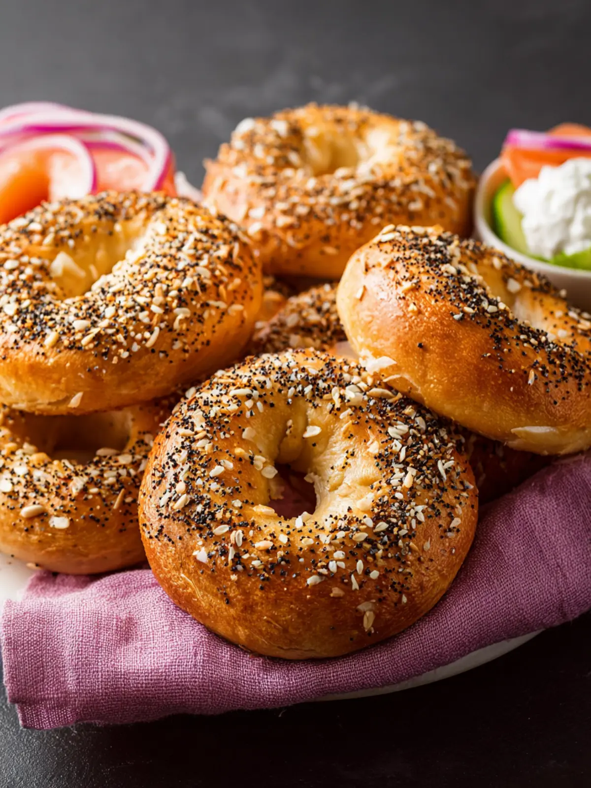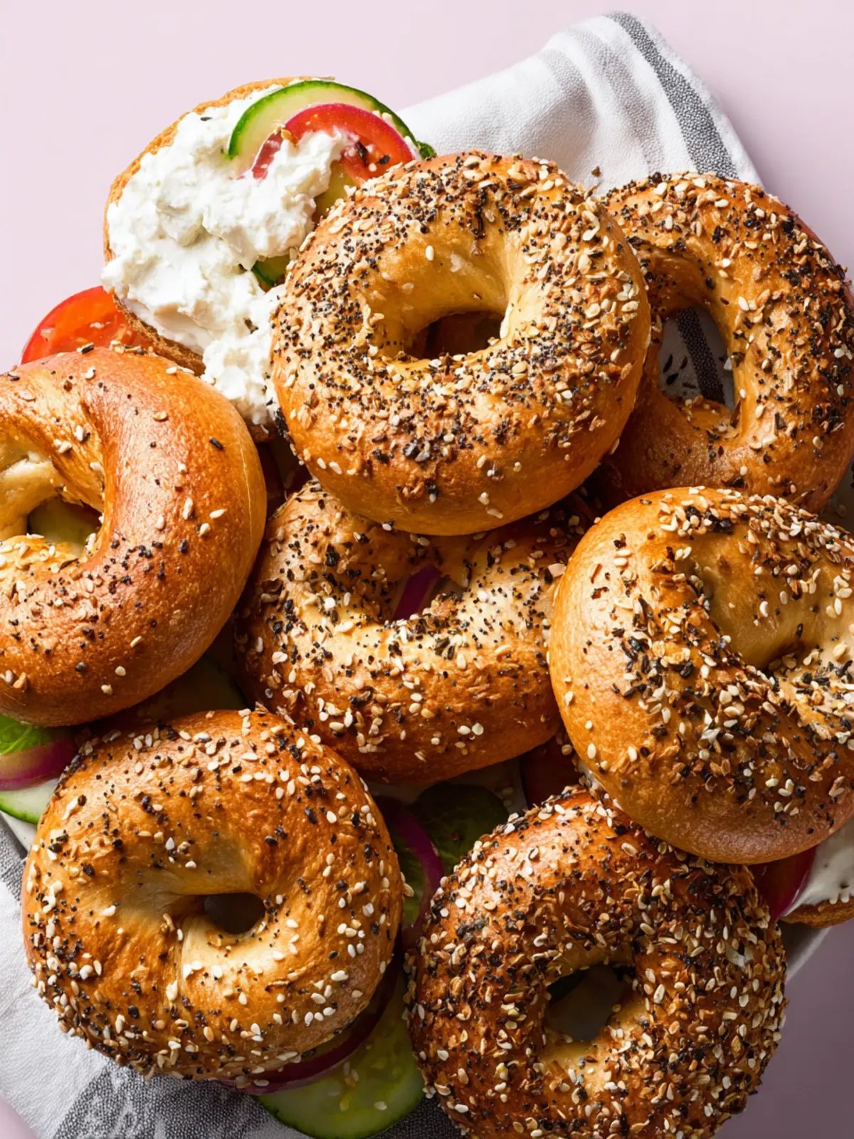 Craving a bagel with a crunch? Top your bagels with an everything bagel seasoning blend before baking. This mix usually includes sesame seeds, poppy seeds, garlic, onion, and salt—perfect for a deliciously seasoned crust that complements any spread.