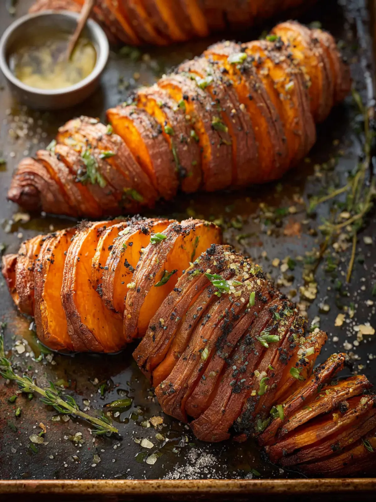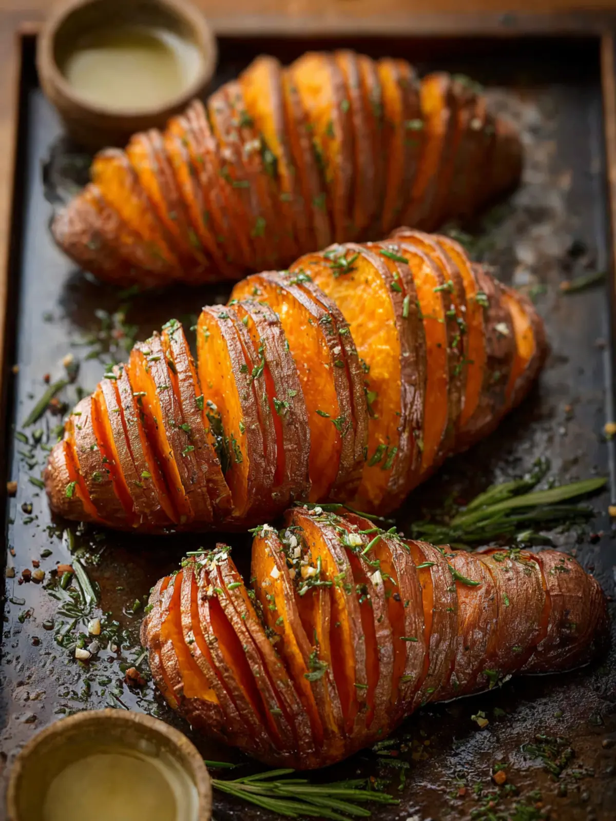 Deliciously crispy on the outside and tender on the inside, these hasselback sweet potatoes are infused with garlic butter and garnished with fresh herbs.