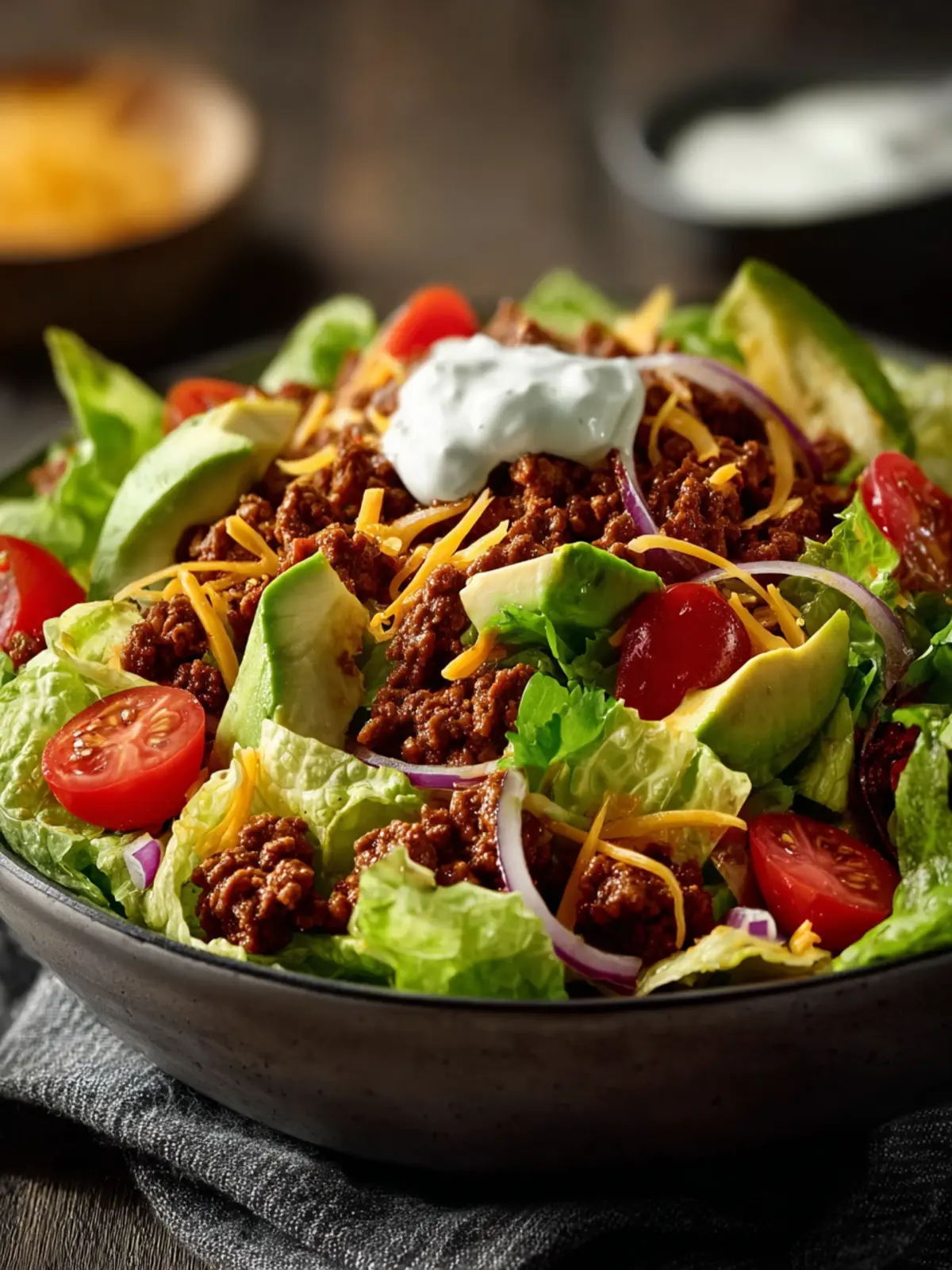 A delicious taco salad made with seasoned ground beef, fresh vegetables, and creamy toppings.