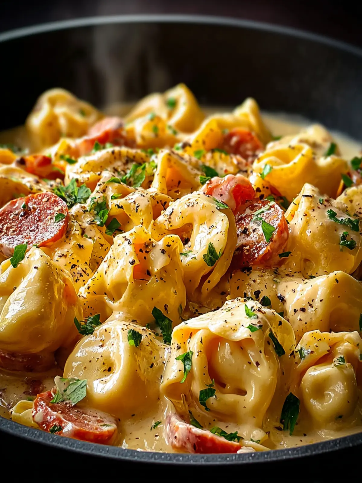 5. Drain the tortellini and add them to the skillet, tossing to coat in the creamy sauce.