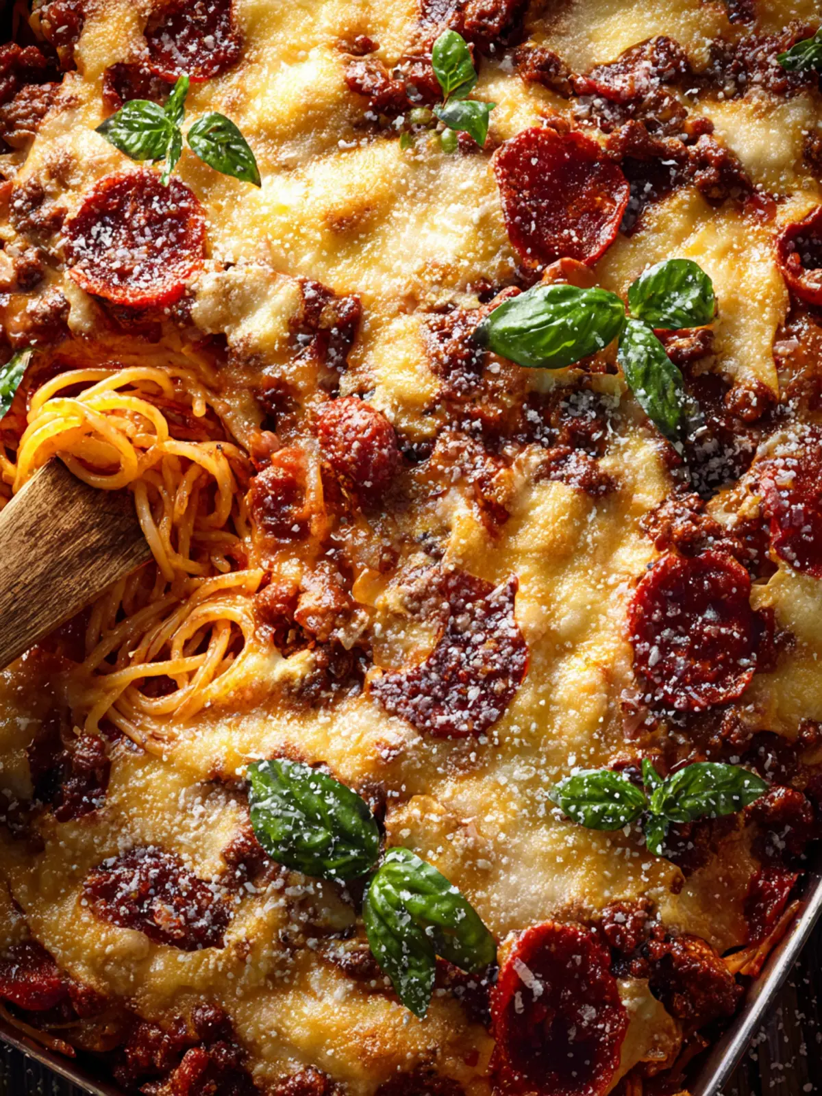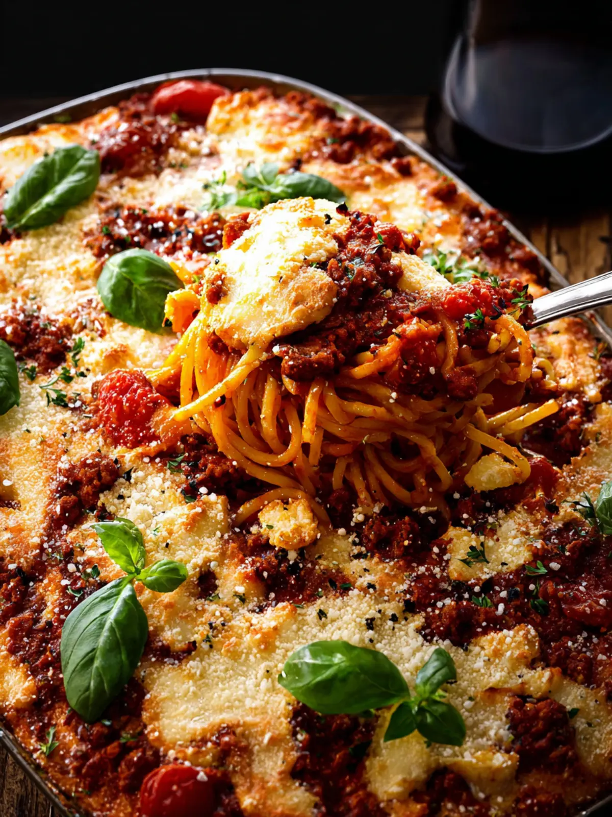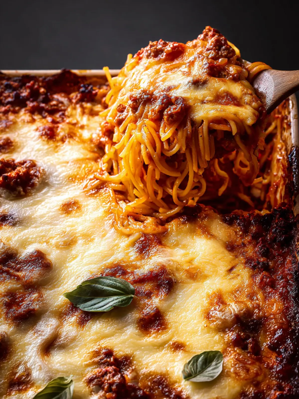 A delicious baked spaghetti dish with meat sauce, cheese, and basil.